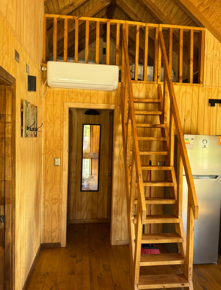 Cada cabaña cuenta con 3 cómodos dormitorios: pieza principal con cama de dos plazas, segunda habitación con camarote y altillo con dos camas individuales, ideales para descansar después de un día de aventuras.